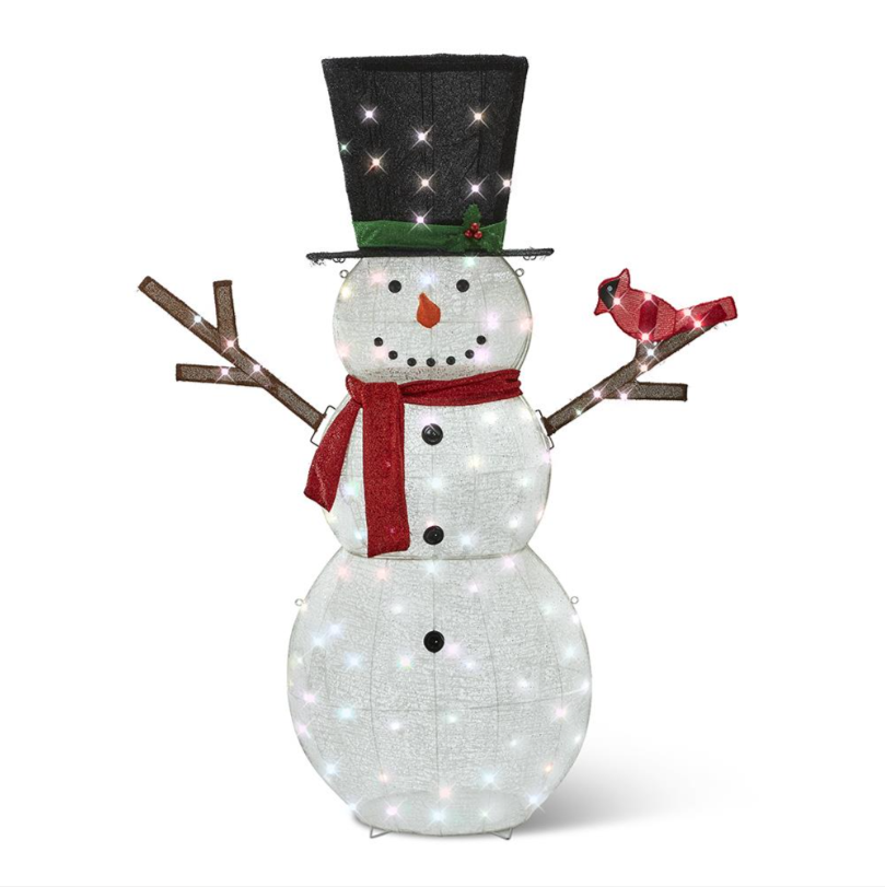 Here's a glowing snowman who greets your visitors with a smile and a friendly cardinal perched on his finger. Snowman comes pre-installed with 100 multi-color LEDs to delight your neighbors and guests. Bright lights illuminate the amiable expression of the snowman, his lively top hat and bright red scarf. Made from a durable metal frame and weatherproof fabric, this trim is designed to withstand winter cold and snowy conditions. AC plug. 72"H x 60"W x 17"D (14 3/4 lbs)