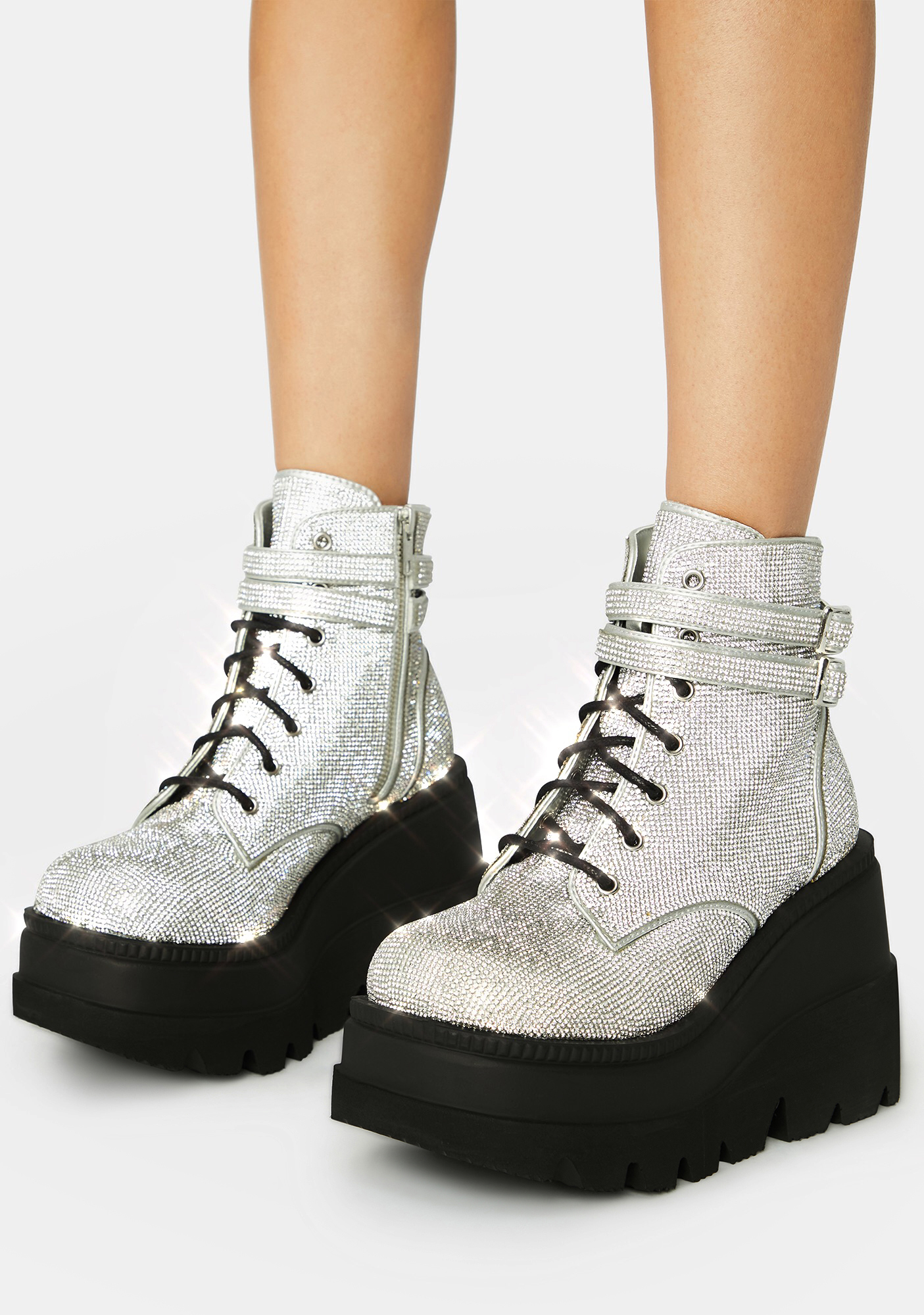 Demonia Bling Technopagan Boots keep on shining, babe! These super exclusive platform boots have blinging rhinestones all over, adjustable laces, side zip closures, and double buckle ankle straps.