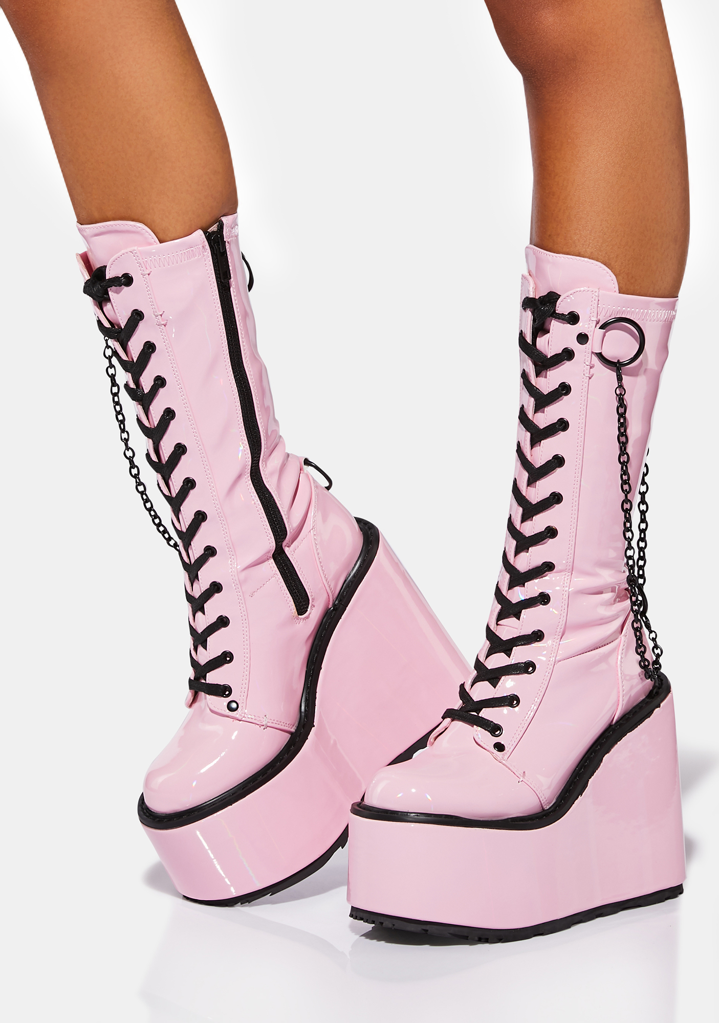 Pink Holographic Purgatory Platform Boots have a calf-high design with a holographic vegan leather construction, wedge platform soles, adjustable laces on the front, side zip closures, and removable chain details.