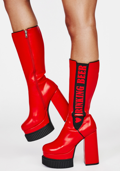 Rock The Party Knee High Boots have a platform creeper sole, a chunky heel, a vegan leather upper with a knee high rise, a zipper closure at the inner calf, and “\u003c3 drinking beer” printed up an outer elastic panel.