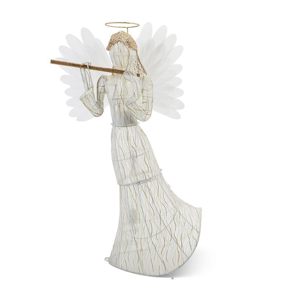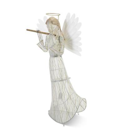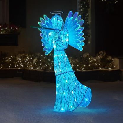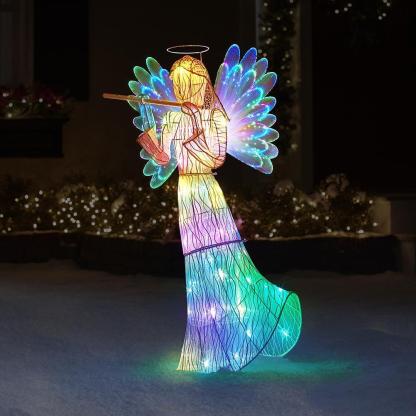 This is the 3'-tall animated angel adorned with glowing fiber optics. The stately Christmas symbol is dressed in a fabric white gown, wears a golden halo, and holds a glittering flute with both hands. Its 42 fiber optic tips are Illuminated by 12 LEDs that produce a slowly alternating rainbow of colors throughout her body and wings. Durable powder-coated steel frame withstands years of outdoor use. Secures to the ground with three included metal stakes. AC plug.